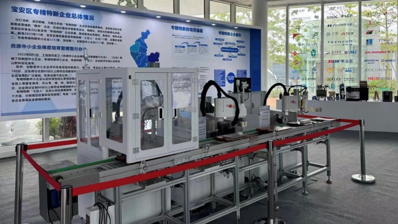 作为宝安专精特新企业亮相展馆的深圳市桃子自动化科技有限公司,携柔性装备生产线入驻“湾区宝安产业展示中心”盒子展馆,柔性装备生产线是通过倍速线和产品夹具载板将产品输送到各个工位,进行工艺作业,每个工位可以根据生产工艺柔性布置不同的生产工作站。该产品不仅反应了当下宝安工业发展成果,也彰显了宝安企业在工业技术领域的研发实力。