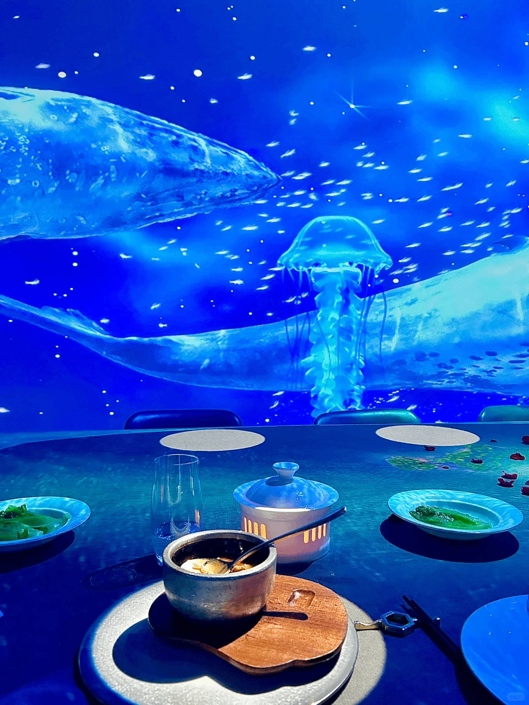 视觉: 你可以置身于任何场景中用餐,海底世界、热带雨林、未来都市…… 每一道菜品的呈现方式也充满惊喜,例如,一条虚拟的鱼可能会在你的餐盘上游动,最终化身为真实的寿司。
