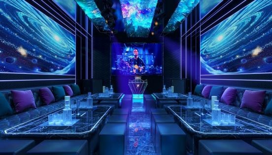 与传统KTV相比,全息光影KTV是动态视觉空间,它屏弃了传统包厢的装修风格,采用数字投影的方式,墙面、地面、桌面作为投影介质,利用投影设备将3D主题场景内容投射在特定介质上,形成沉浸式视觉空间,让客户身处动态的场景,在欢声歌唱的同时感受动态主题所带来的震撼体验。