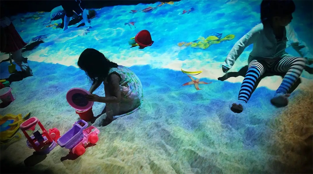 通过红外传感器或雷达设备捕捉人体动作,结合Unity3D等互动软件,实现“人走浪动”的交互效果。例如,用户踩地面时,海浪会实时退散并留下脚印,增强参与感。