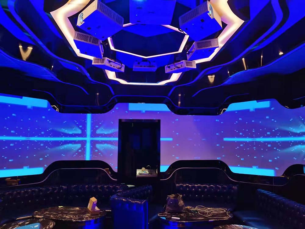 沉浸式KTV,融合了动作捕捉系统,人可以和投影画面产生互动,随着消费者动作、位置的变动,投射画面随之也会出现变化,趣味十足。